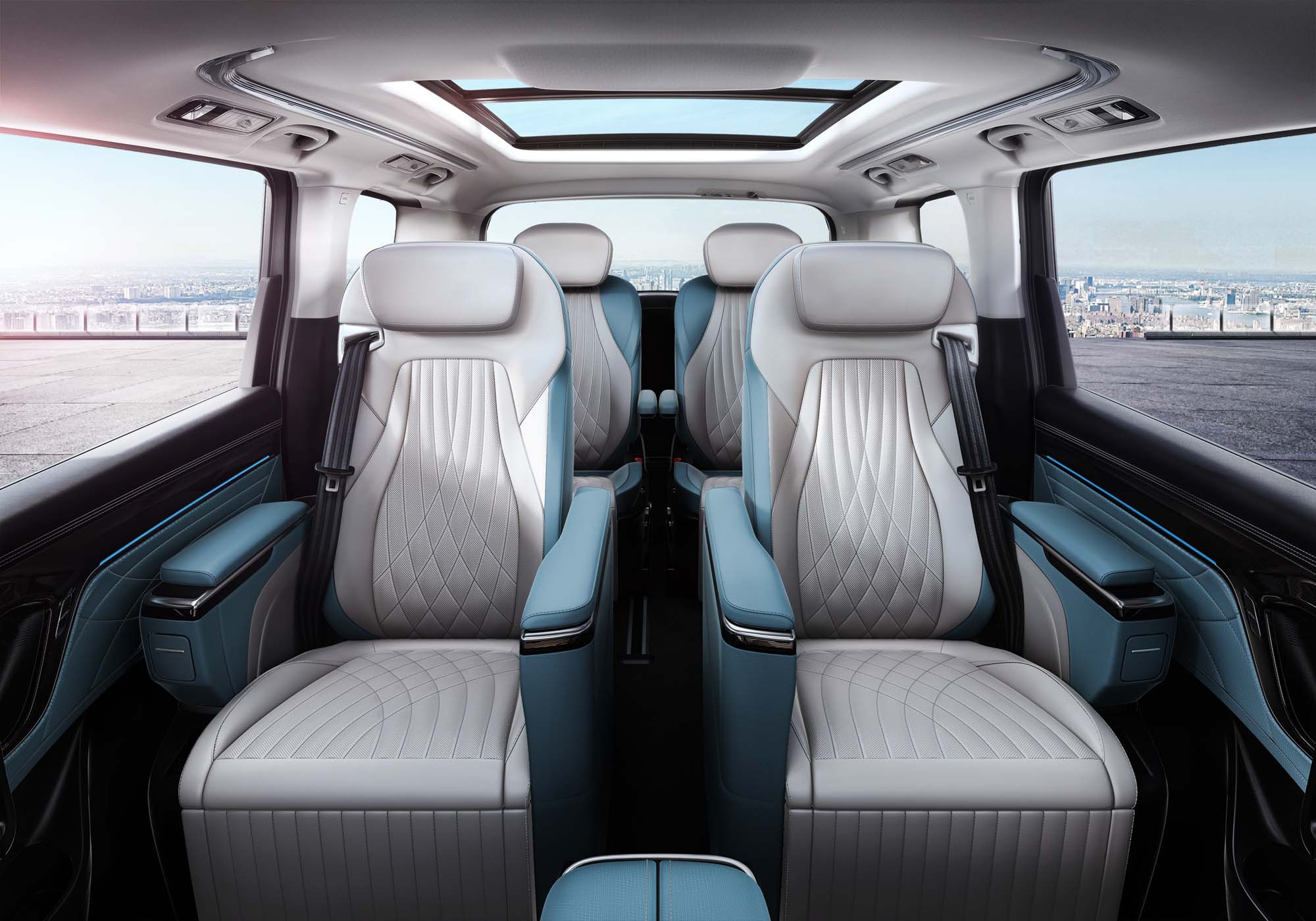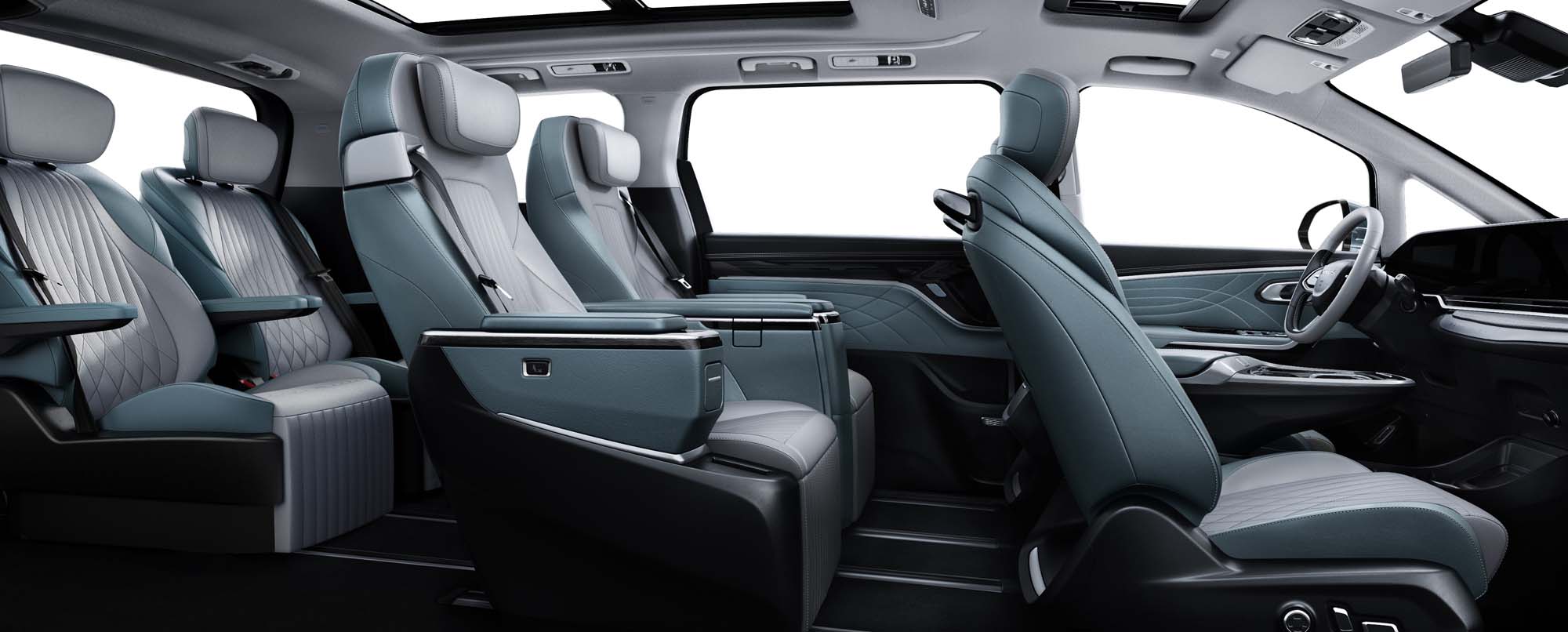 На торпедо расположен тройной дисплей, а всего в салоне их десять (включая развлекательные системы сзади). За высокоскоростную связь с внешним миром и интерфейс отвечает двухъядерная система на базе чипов Qualcomm 8155 и MediaTek 8666. В список оснащения минивэна вошли активные помощники при вождении, благодаря которым он способен перемещаться по дорогам в полуавтономном режиме, перестраиваться или, например, припарковать минивэн.