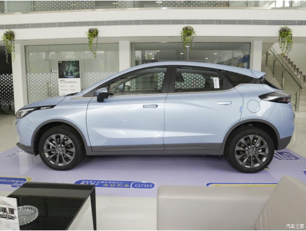 Полностью электрический кроссовер Geely Geometry M6 имеет закрытую переднюю решетку, дополненную светящимся логотип..