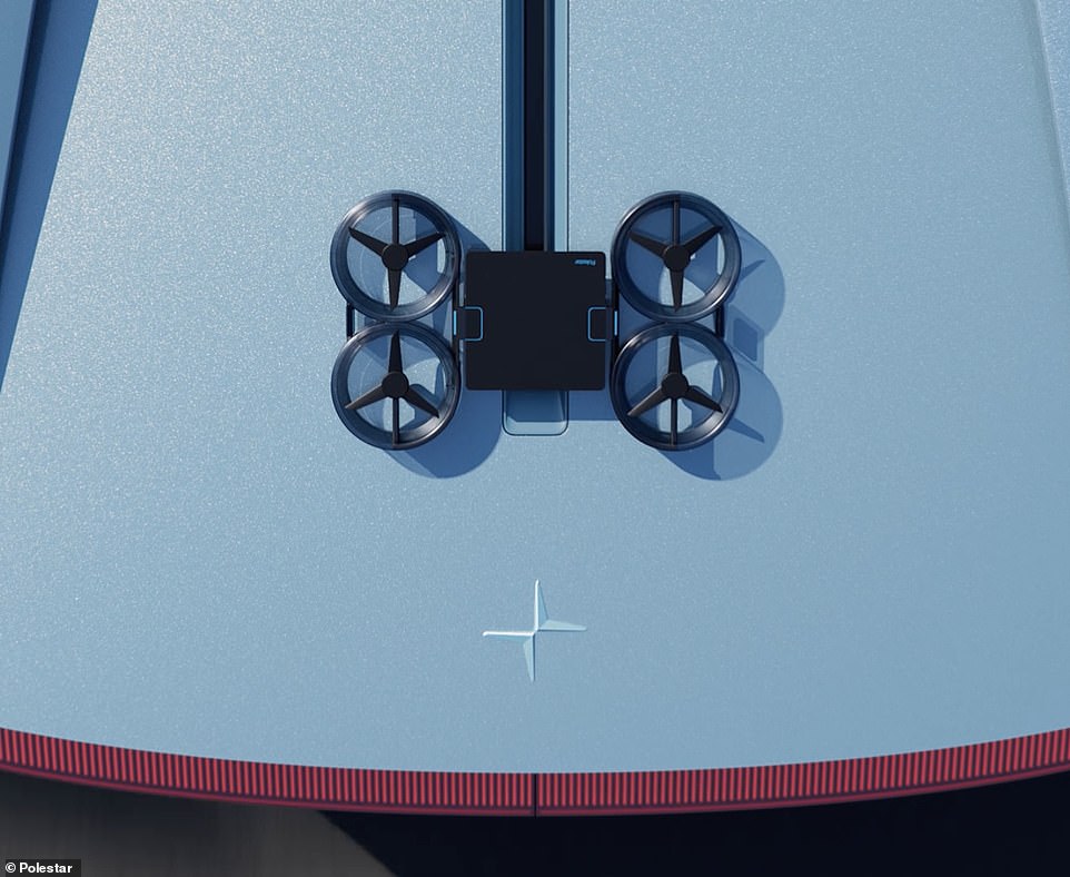 Стоит отметить, что за задними сидениями электрокара расположен дрон для аэрофотосъемки. Называется он Hoco Flow и разработан в сотрудничестве с брендом бытовой электроники Aerofugia. Инженеры Polestar разработали специальное крыло, которое поднимается за задними сиденьями, создавая зону отрицательного давления, позволяющую дрону взлетать во время движения, также дрон может автоматически следовать за транспортным средством с максимальной скоростью 90 км/ч.
